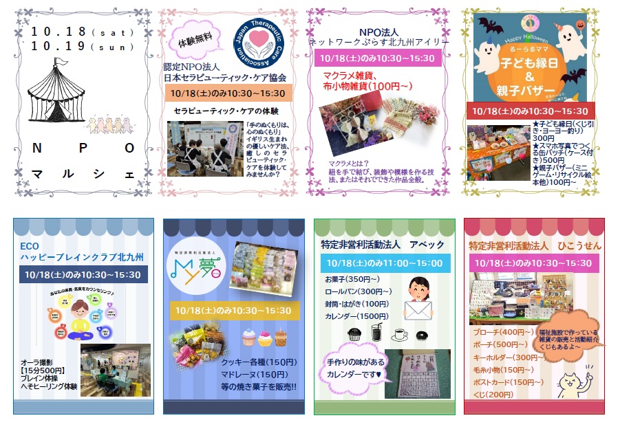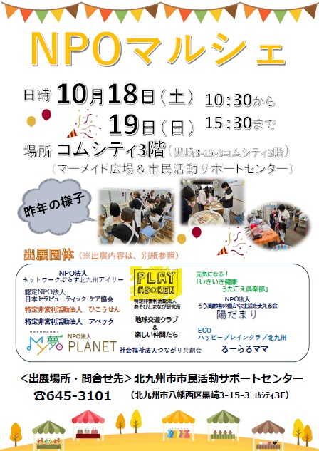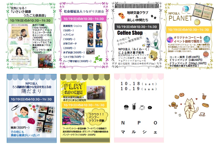 市民活動サポートセンターでは、10月18日(土)・19日(日)にNPOマルシェを開催します。