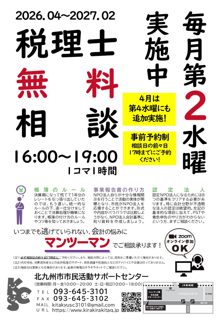 NPO法人の会計や税務に関して、税理士に無料で相談できます(要予約)